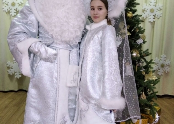 Роскошные костюмы Деда Мороза и Снегурочки, сшитые на заказ из серебристой парчи.